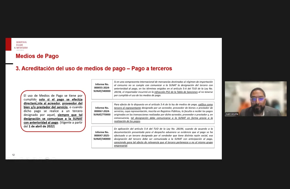 El 30 de octubre de 2025, la Cámara de Comercio Peruano China y Rodrigo Elias & Medrano Abogados realizaron el Webinar Acreditación de Uso de Medios de Pago en Operaciones de Importación, via zoom.